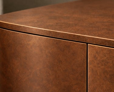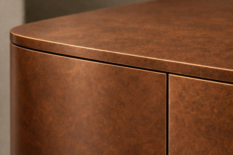 El mueble se construye a partir de tablero chapado en metal, mediante la aplicación de láminas que cubren cada plano. Este proceso revela en los cantos la naturaleza del material, mostrando la unión entre soporte y chapa, una mezcla que aporta expresividad sin perder precisión.