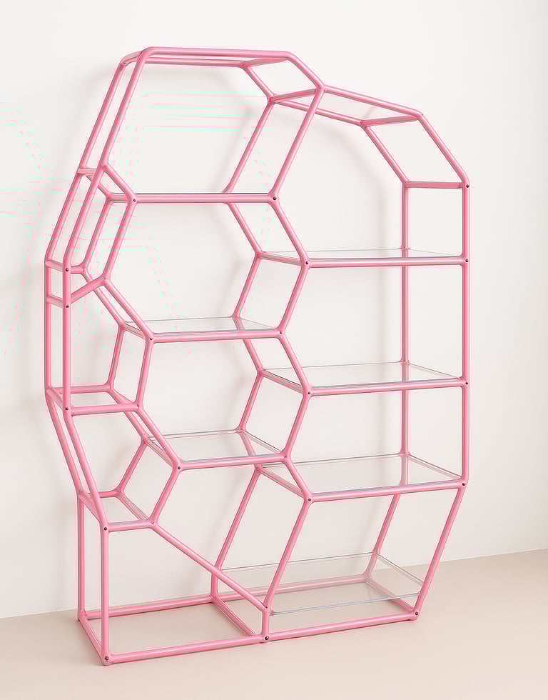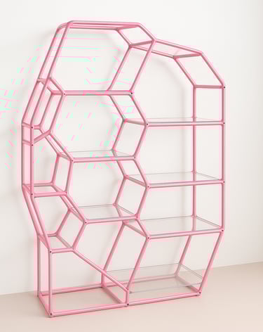 Lúdica, escultórica y orgánica, esta estantería transforma un objeto cotidiano en una pieza con identidad propia. Su estructura metálica, inspirada en patrones geométricos irregulares, dibuja una retícula tridimensional que recuerda a formaciones naturales, rompiendo con la rigidez de las estanterías convencionales.