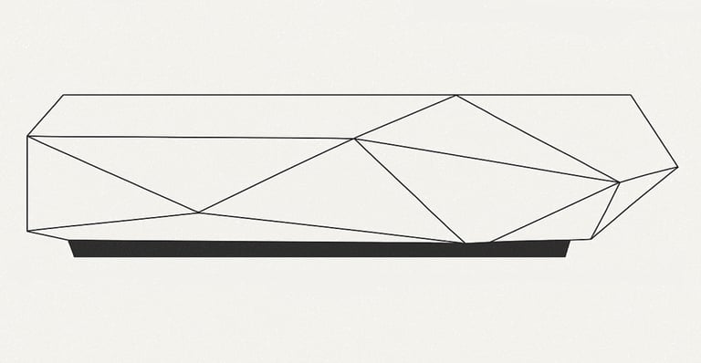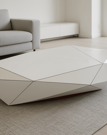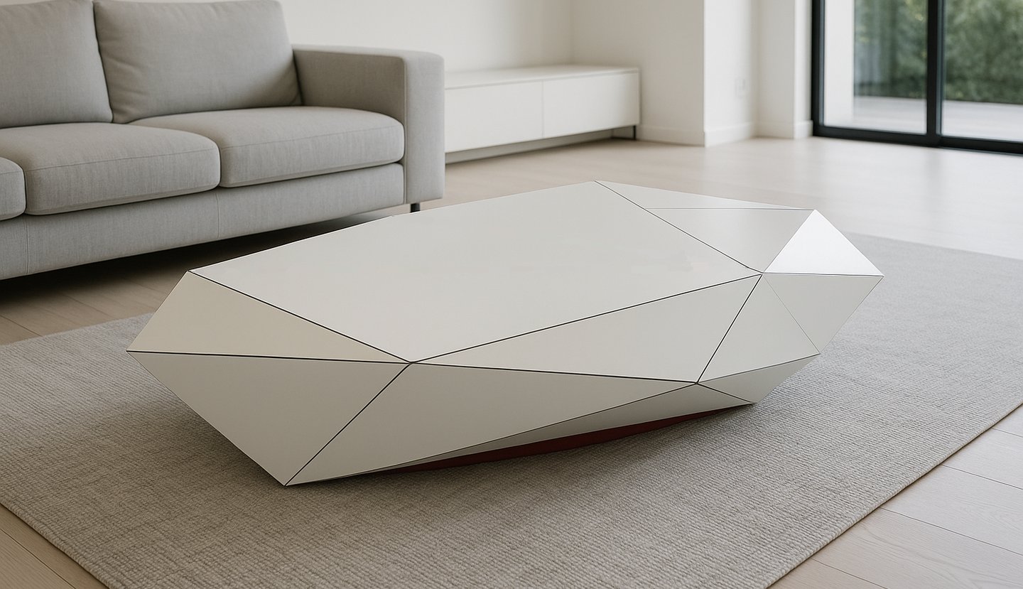 Mesa de centro de geometría poliédrica diseñada a partir de planos inclinados continuos. La composición volumétrica genera diferentes lecturas según la incidencia de la luz y el punto de vista.