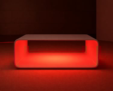 Luz roja profunda y envolvente que transforma la pieza en un elemento vibrante y escultural, generando una atmósfera cálida y sugerente.